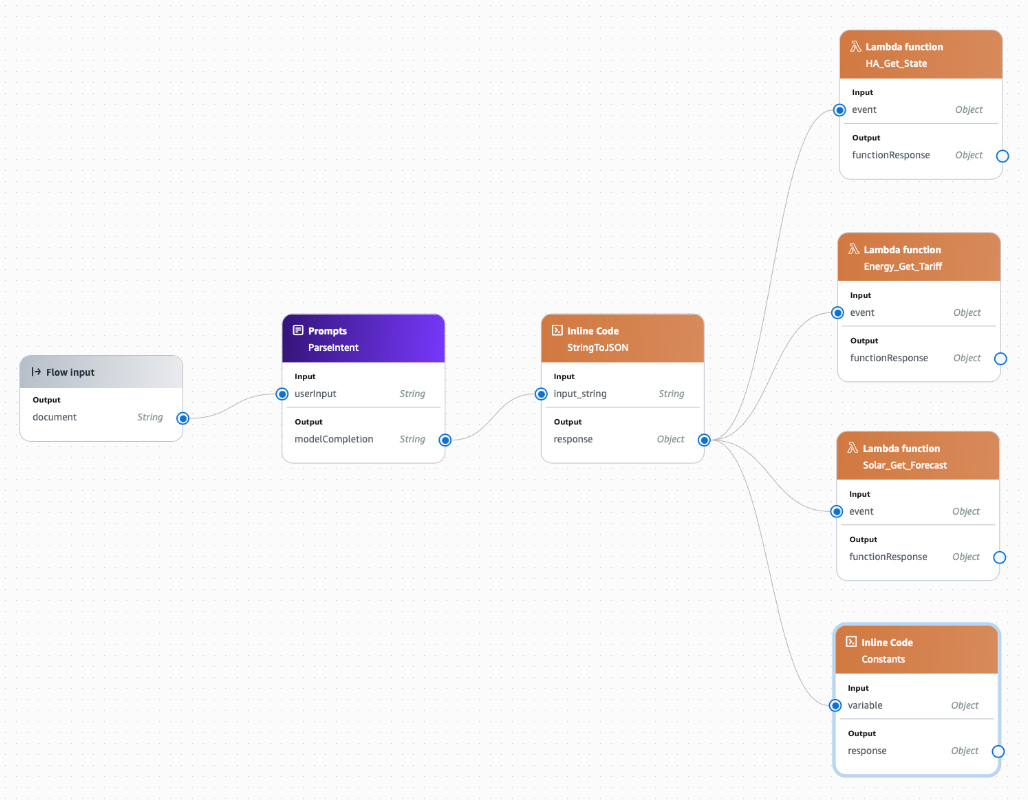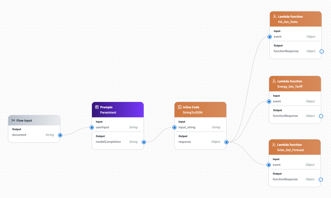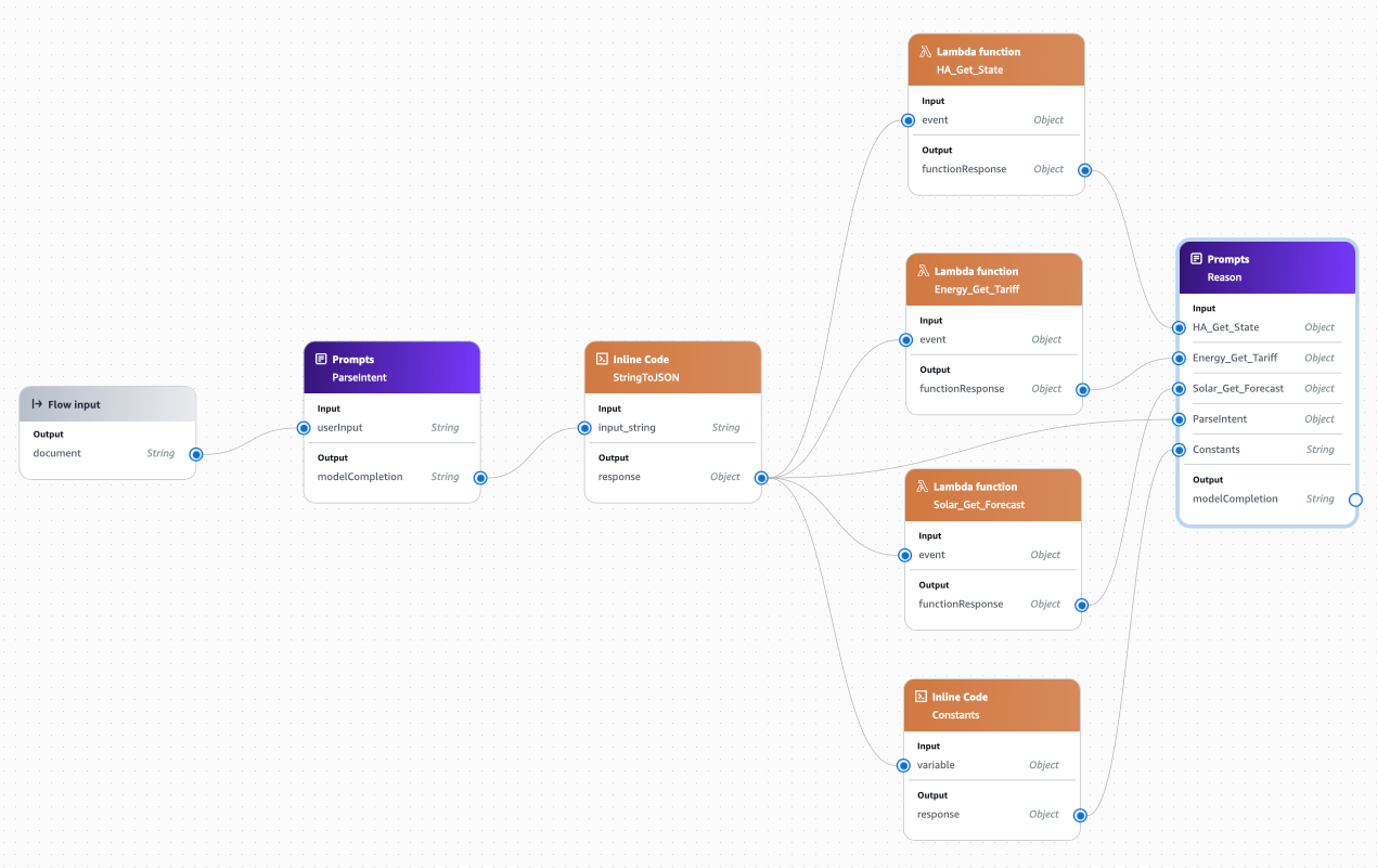 functionResponseoutput of HA_Get_State to theHA_Get_Stateinput of ReasonfunctionResponseoutput of Energy_Get_Tariff to theEnergy_Get_Tariffinput of ReasonfunctionResponseoutput of Solar_Get_Forecast to theSolar_Get_Forecastinput of Reasonresponseoutput of Constants to theConstantsinput of Reasonresponseoutput of StringToJSON to theParseIntentinput of Reason - note, this is different to the others and provides the Reason node with the original prompt which the user asked.