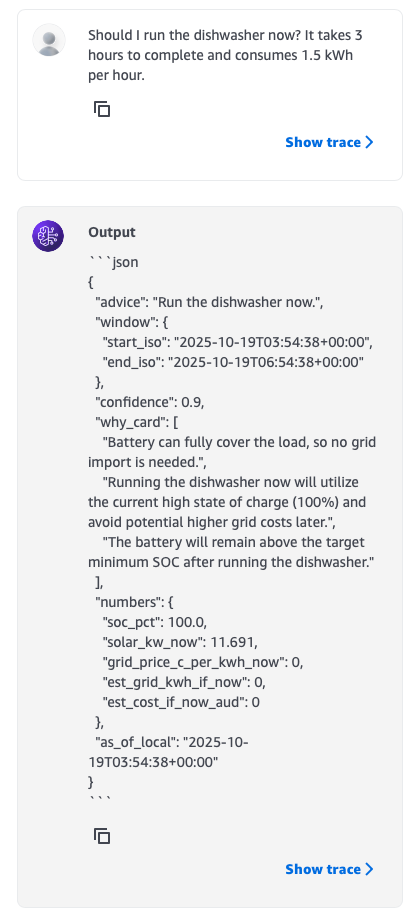 I want to build an agentic AI "energy assistant" who I can ask for advice about the best time to run appliances, and it will consider various bits of data (current solar production, solar forecast, battery state of charge, etc) to provide a recommendation.