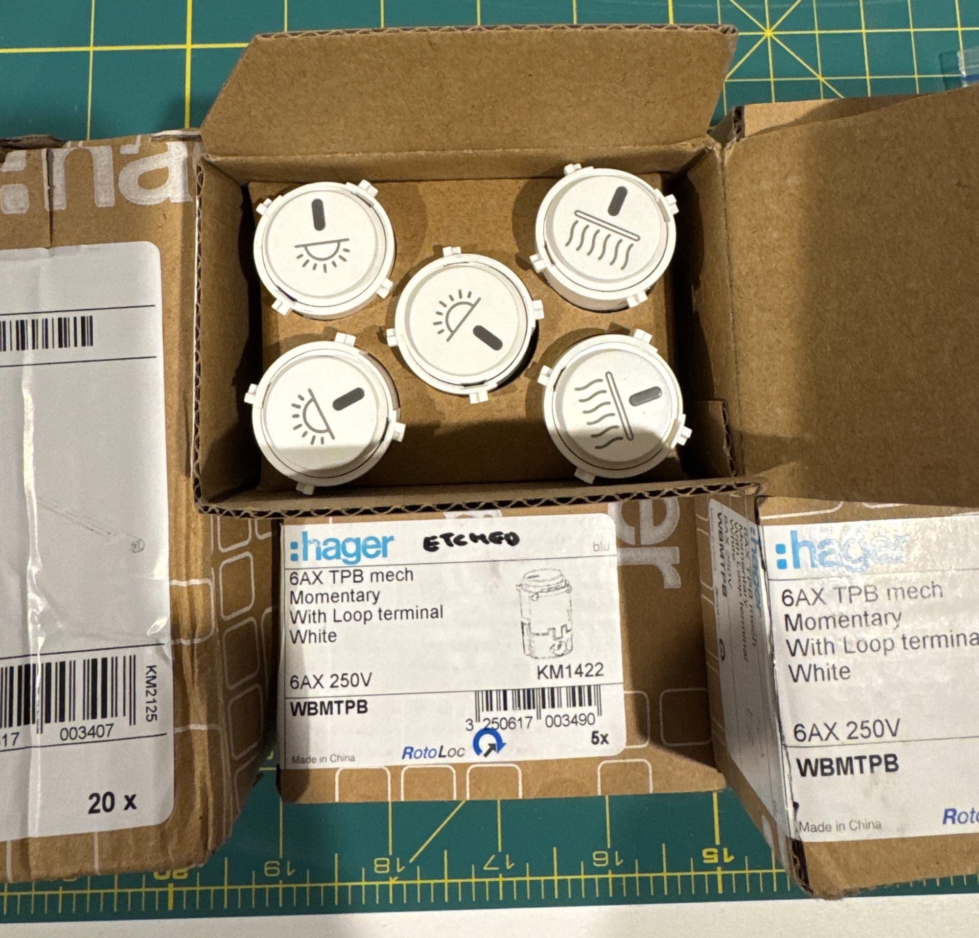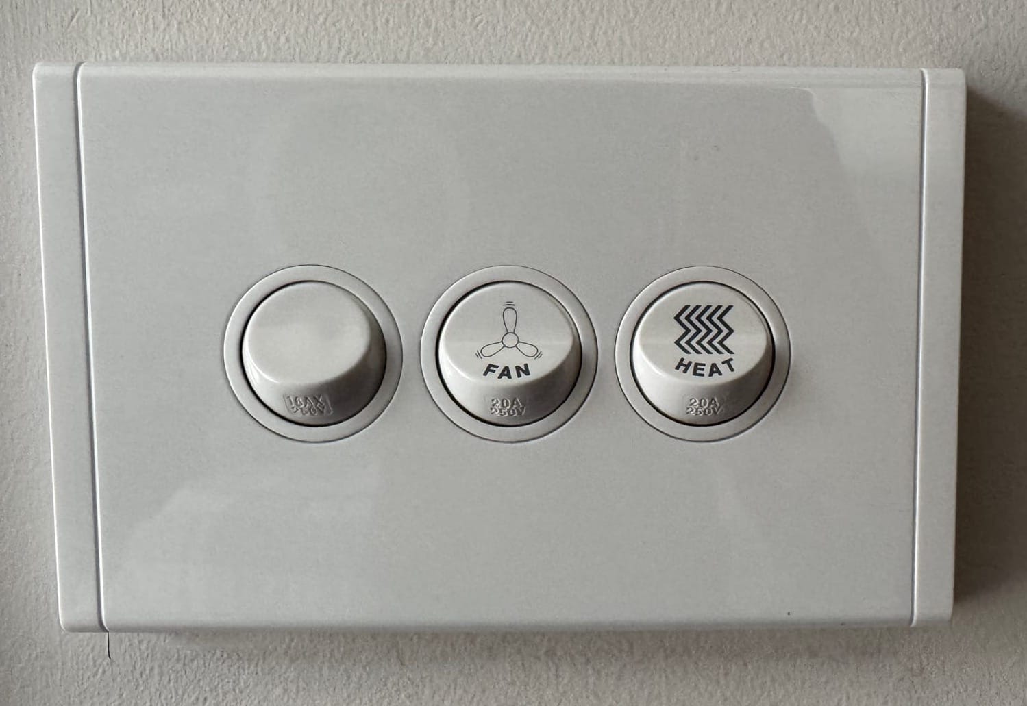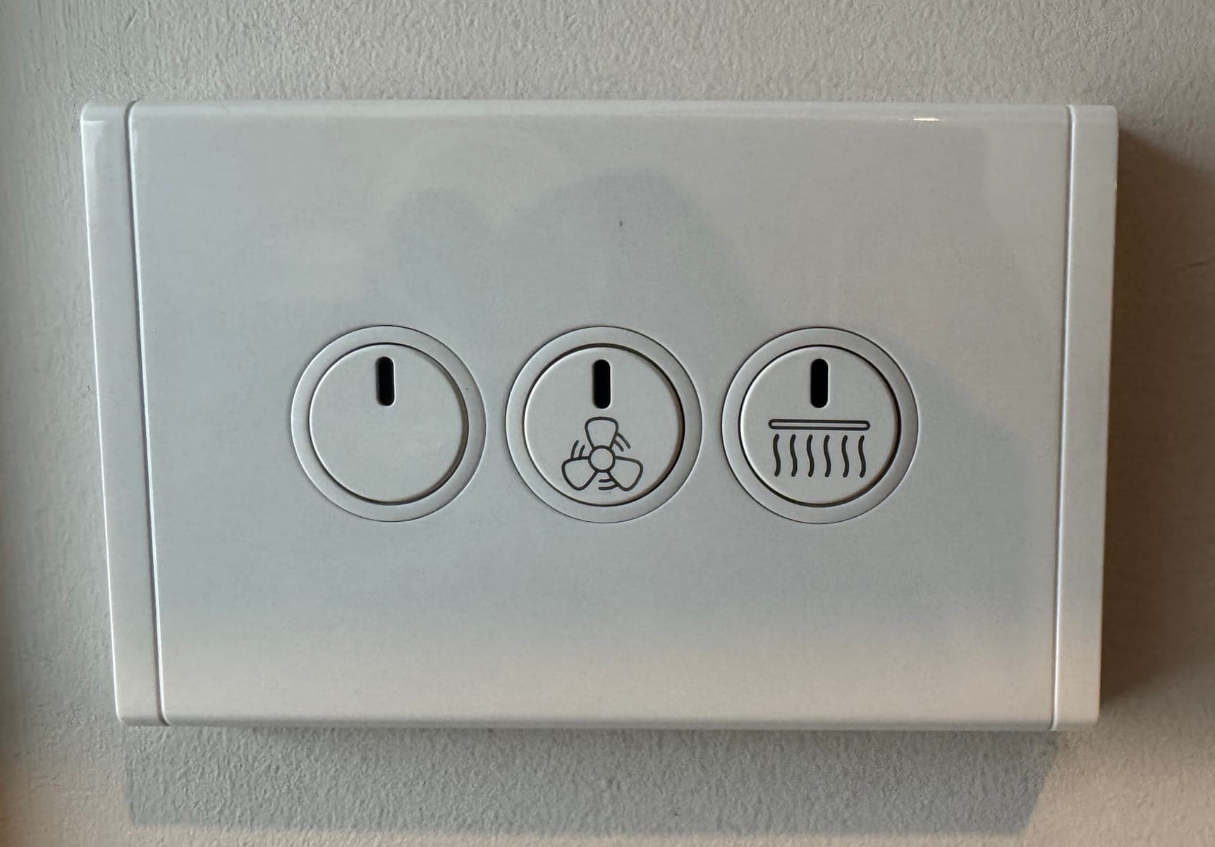 You’ll see in the photo above that some of the mechs have also been etched. Unlike the previous Hager switches, I could not buy WBMTPB mechs pre-etched with functions like heat and fan. I found a business in Australia called Lightscribe Laser who specialise in etching mechs.